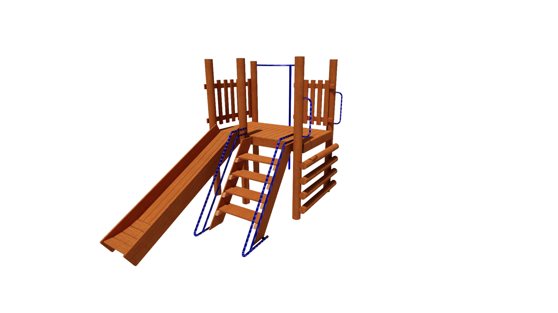 Playground rústico de madeira, resistente para utilização sob sol e chuva.