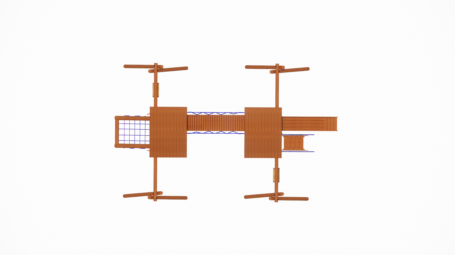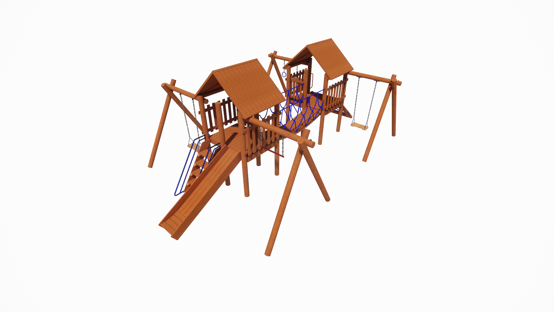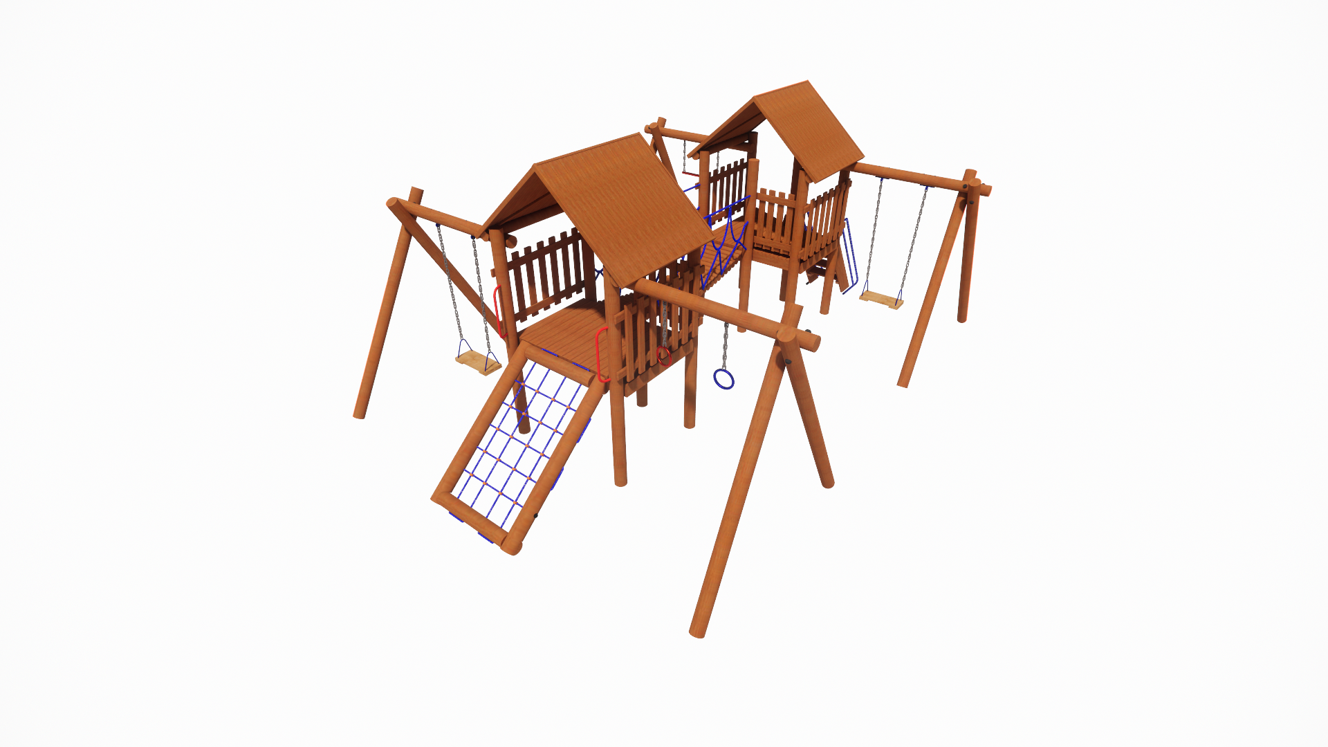 Playground rústico de madeira, resistente para utilização sob sol e chuva.