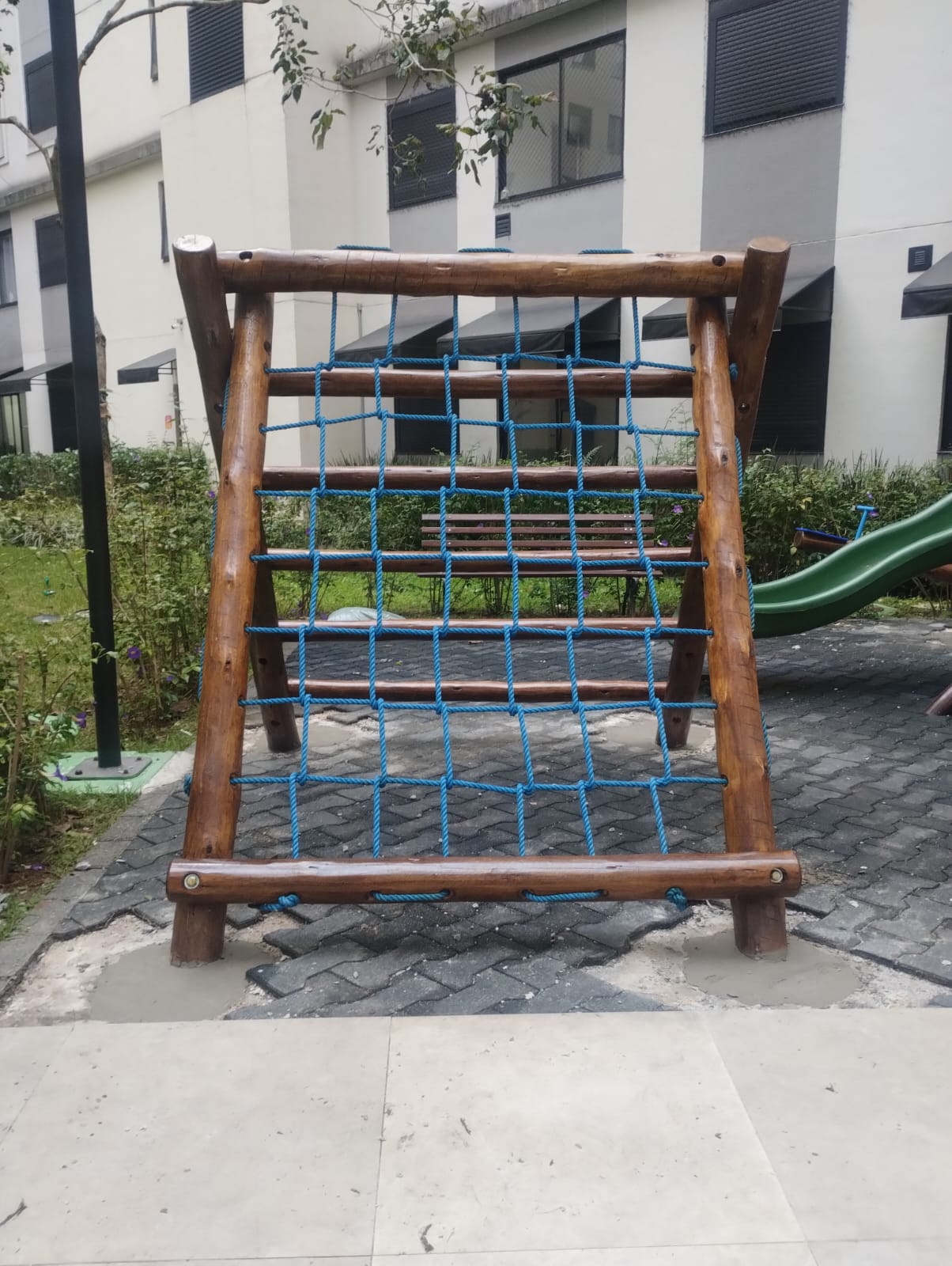 Playground rústico de madeira, resistente para utilização sob sol e chuva.